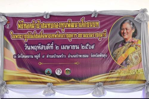 โดยมีนายสุจินต์ วาจากิจ ผู้ว่าราชการจังหวัดพัทลุง เป็นประธานในพิธีทอดผ้าป่าสมทบกองทุนพัฒนาเด็กชนบท ในพระราชูปถัมภ์สมเด็จพระเทพรัตนราชสุดาฯ สยามบรมราชกุมารี ซึ่งมี นายสรวิศ แก้วหัวไทร นายอำเภอป่าพะยอม กล่าวให้การต้อนรับ และนายประโมทย์ ดำจวนลม พัฒนาการจังหวัดพัทลุง เป็นผู้กล่าวรายงานวัตถุประสงค์การจัดงาน พร้อมด้วยส่วนราชการ ผู้นำท้องที่ ผู้นำท้องถิ่น เจ้าหน้าที่พัฒนาชุมชน กลุ่มองค์กรต่างๆ และพุทธศาสนิกชนผู้มีจิตศรัทธาเข้าร่วมพิธีอย่างพร้อมเพรียง